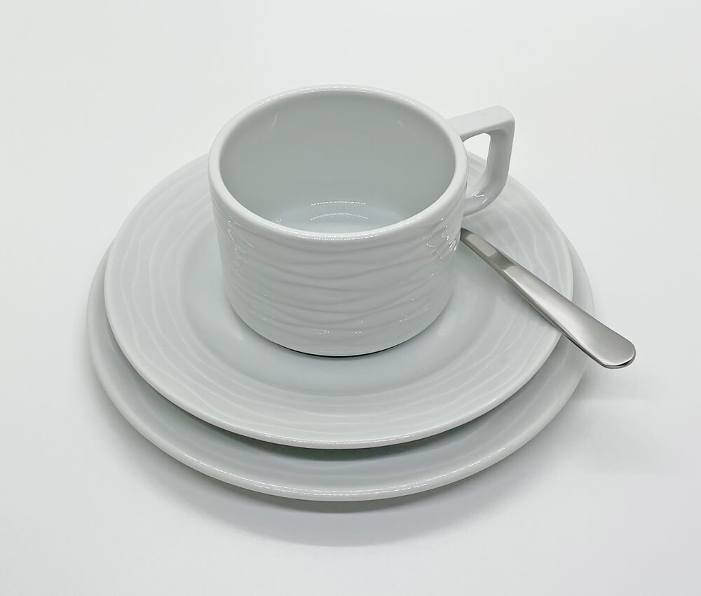 Sisältää kahvikupin (18 cl), aluslautasen (Ø 15 cm), kakkulautasen (Ø 17,5 cm) ja lusikan.