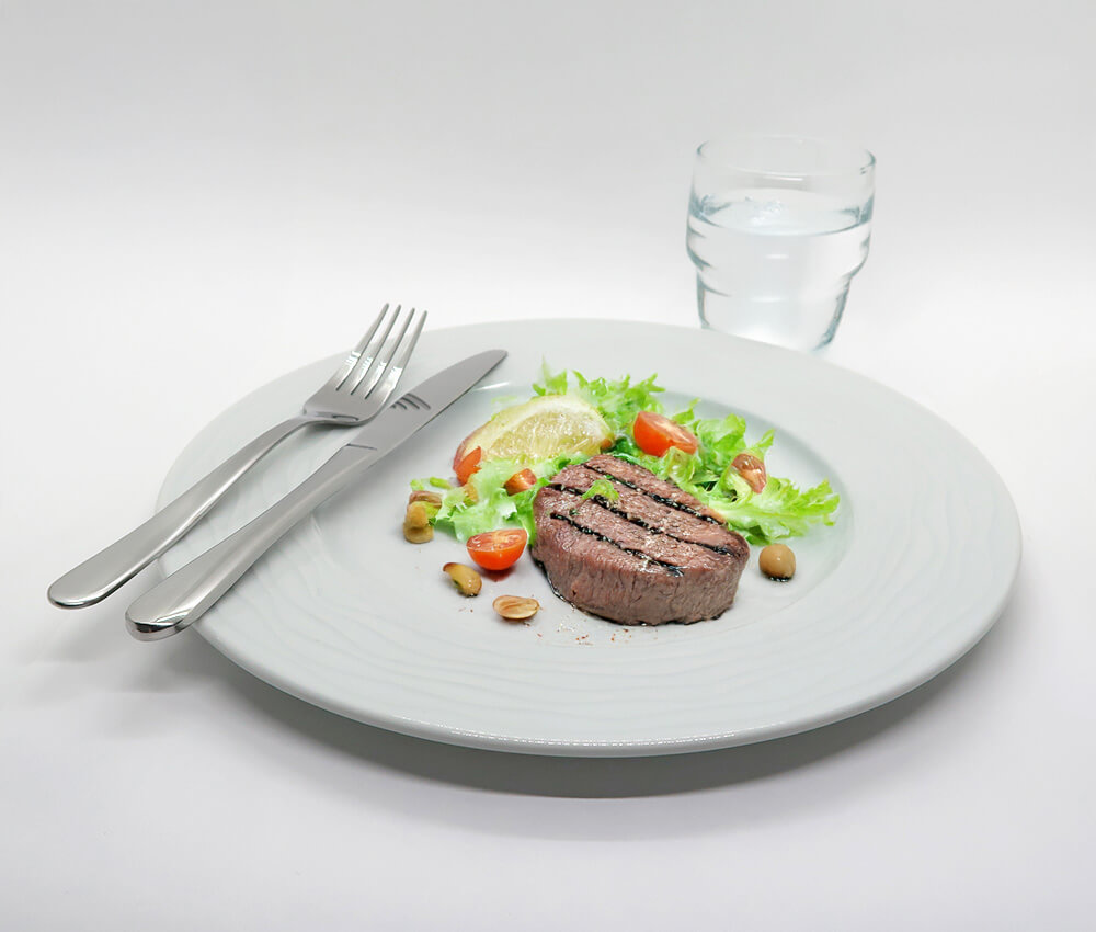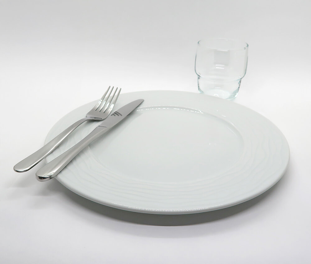 Sisältää ruokalautasen (Ø 27 cm), haarukan ja veitsen sekä juomalasin (28 cl).