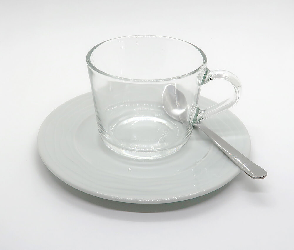 Sisältää lasisen teekupin (24 cl), kakkulautasen (Ø 17,5 cm) ja pikkulusikan.